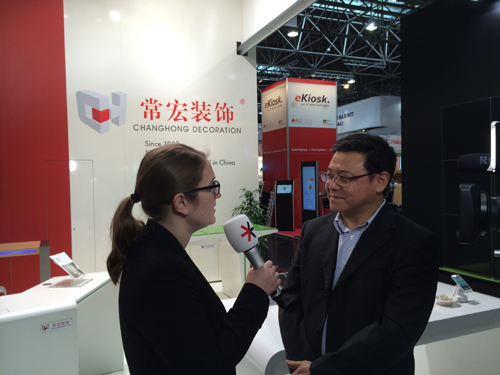 做為中國(guó)參展企業(yè)的代表,常宏裝飾總經(jīng)理王躍先生在展位接受了展會(huì)主辦方(杜塞爾多夫展覽公司)的采訪,就歐洲零售業(yè)、中國(guó)零售業(yè)和EuroShop等主題闡述了常宏裝飾的觀點(diǎn)和建議。