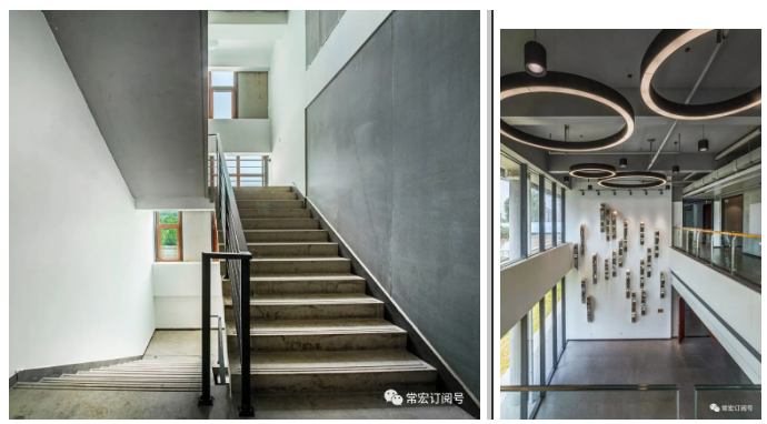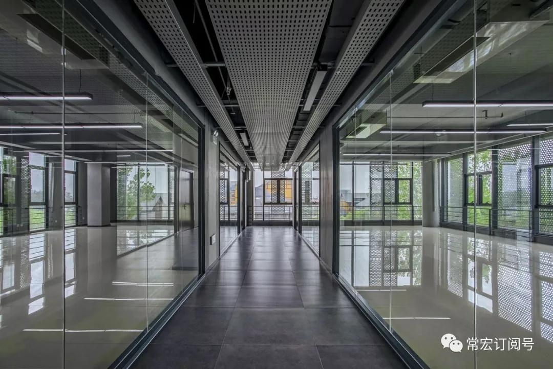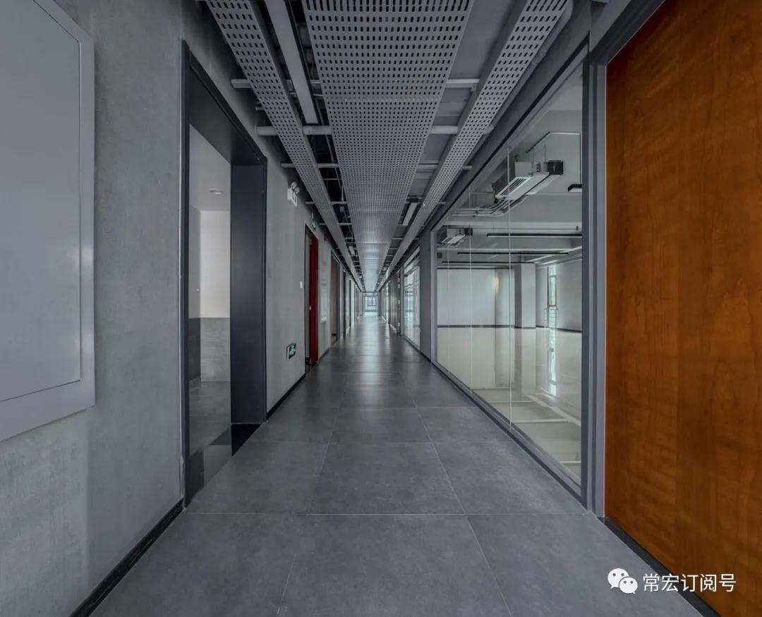 本項目室內(nèi)設(shè)計風格延續(xù)了外觀設(shè)計的工業(yè)建筑特點,把清水面的樸素質(zhì)感延伸到室內(nèi)。如室內(nèi)走廊吊頂各種管線的外露,加以穿孔鋁板半遮半掩的裝飾,既強調(diào)了工業(yè)特點,又是對建筑外觀裝飾語言的延續(xù)和呼應(yīng)。整個室內(nèi)的空間設(shè)計與建筑融為一體。