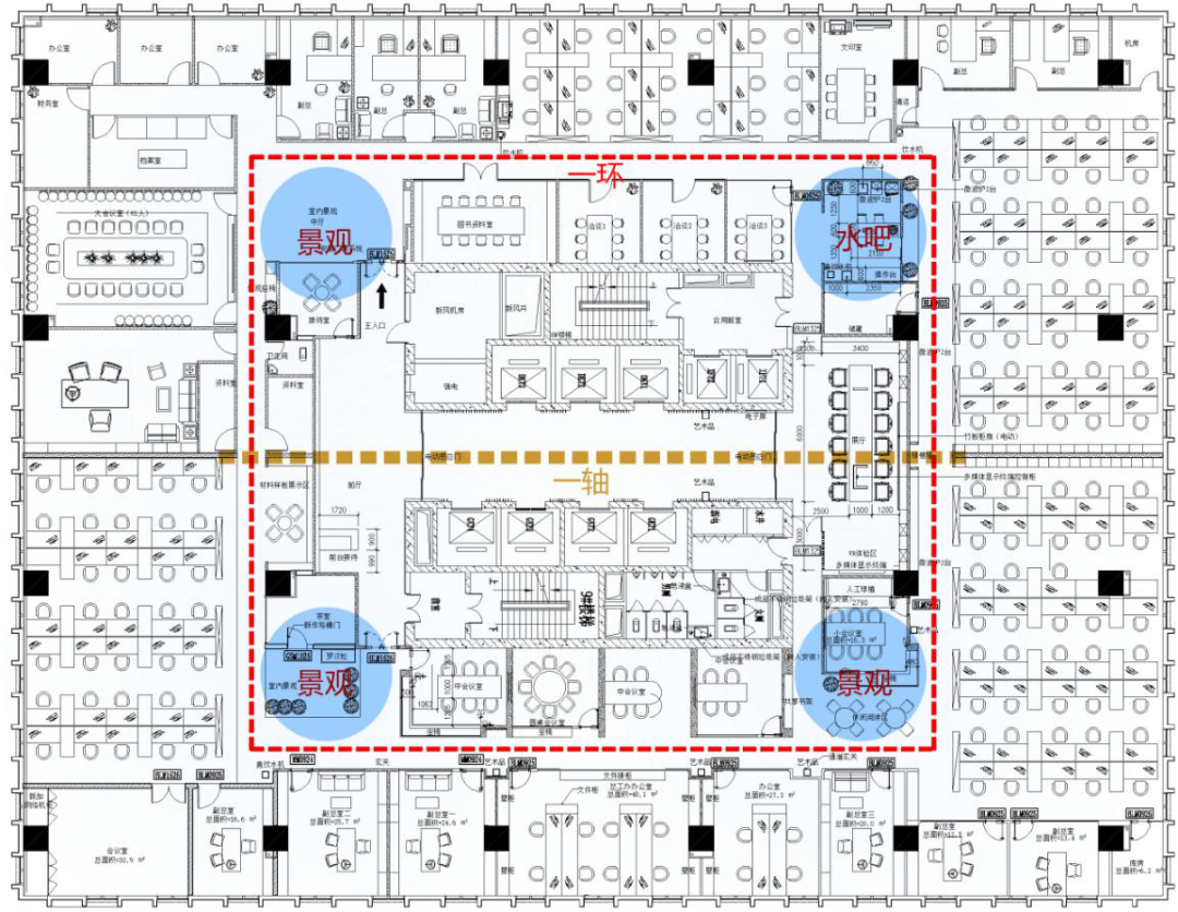空間動線規(guī)劃是辦公空間設(shè)計(jì)的核心,平衡功能需求與原有建筑本體的關(guān)系,進(jìn)而形成一軸、一環(huán)、四節(jié)點(diǎn)的總體布局,來回應(yīng)企業(yè)日常辦公、商務(wù)禮儀的功能需要。