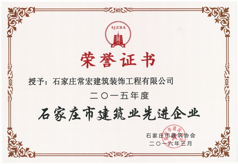 常宏建筑裝飾工程有限公司憑借夯實(shí)的專(zhuān)業(yè)技術(shù)、良好的信譽(yù)、完善的服務(wù),得到大眾及專(zhuān)家領(lǐng)導(dǎo)的信任及肯定,榮獲2015年度石家莊市建筑業(yè)先進(jìn)企業(yè)以及2014-2015年度石家莊市建筑業(yè)誠(chéng)信企業(yè)。