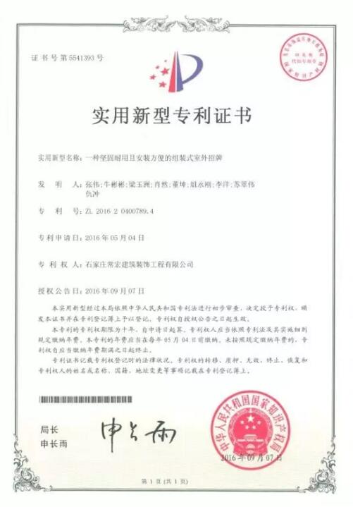 近日,常宏建筑裝飾工程有限公司榮獲由中華人民共和國國家知識產(chǎn)權(quán)局頒發(fā)的2項實用新型專利證書。分別為:一種弧型廣告牌,專利號為:ZL 2016 2 0189323.4,專利權(quán)期限為十年;一種堅固耐用且安裝方便的組裝式室外招牌,專利號為:ZL 2016 2 0400789.4. 專利權(quán)期限為十年。在此我們表示熱烈的祝賀。