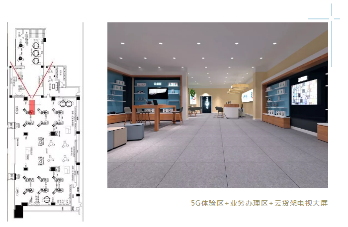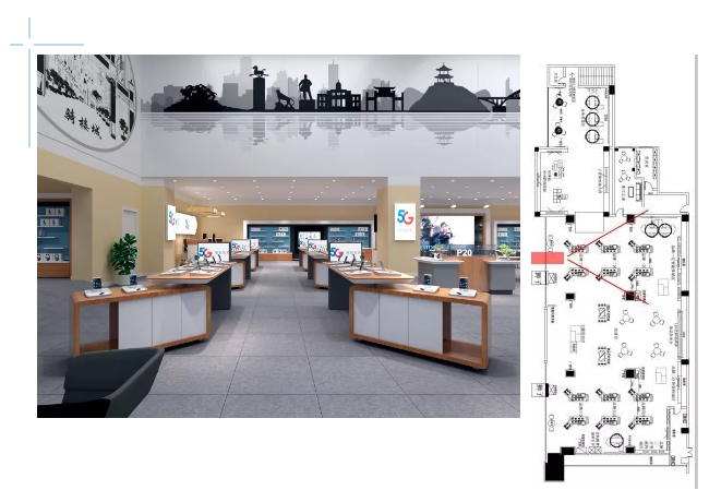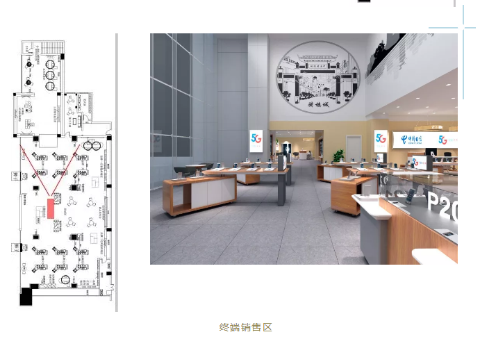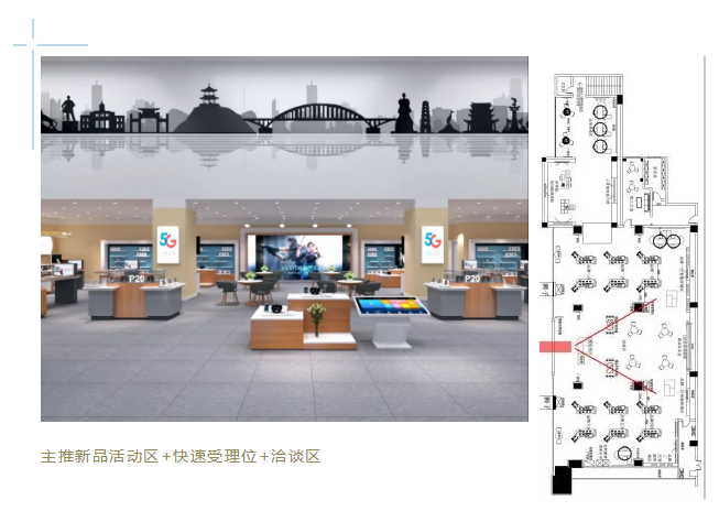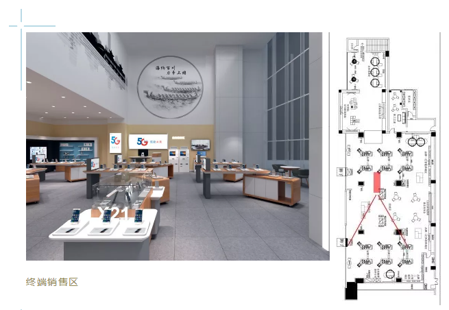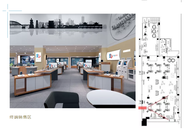 在功能分區(qū)方面,空間采用分區(qū)不區(qū)分的輻射設(shè)計(jì):輻射型分區(qū)覆蓋原有的所有功能,各功能區(qū)無縫連接。以終端體驗(yàn)為核心,休閑與服務(wù)體驗(yàn)分散于周邊,在終端體驗(yàn)區(qū),實(shí)現(xiàn)終端體驗(yàn)、套餐定制、購(gòu)買、流量定制一體化;在休閑服務(wù)區(qū),實(shí)現(xiàn)驗(yàn)機(jī)、下載、娛樂、休息一體化。