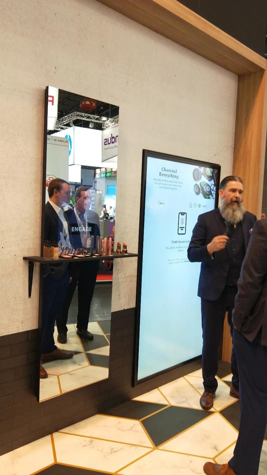 在它的旁邊是一款智能貨架,兩個層板上的產(chǎn)品均可以顯示價格,同時當產(chǎn)品位置發(fā)生變換的時候,價格也跟著調(diào)整。背面是一整塊大屏幕,閑時播放產(chǎn)品廣告遠距離傳播,當有產(chǎn)品被拿取的時候大屏幕會以畫中畫的形式展示所拿取商品的信息。