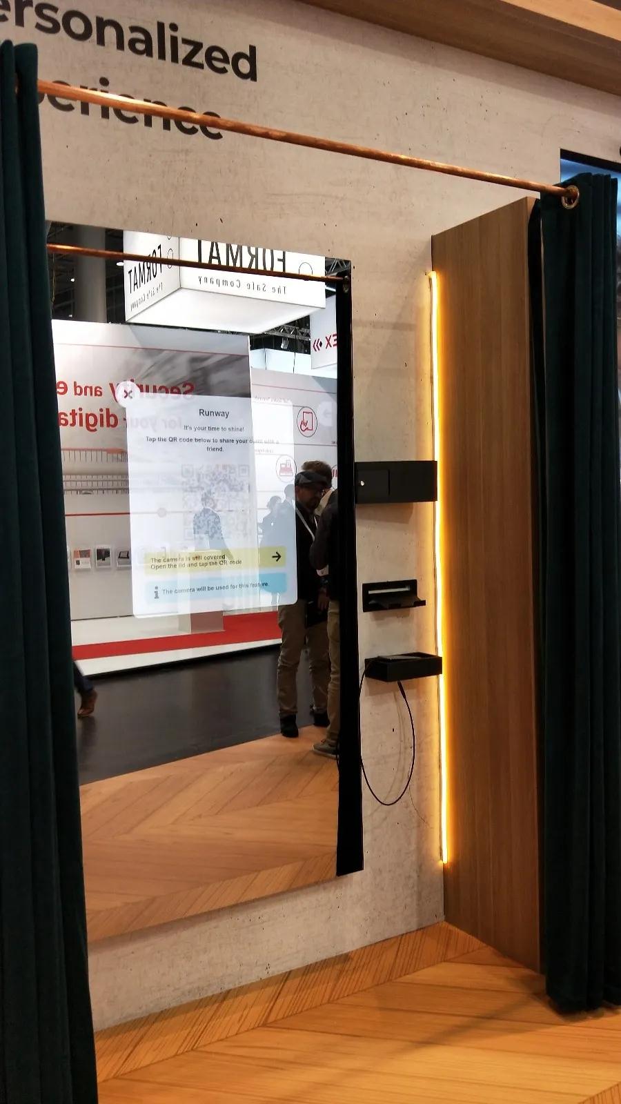 下面一組是智能試衣間,人在里面不但可以照鏡子,還可以選取與自己所選衣服合適的搭配(如帽子、眼睛、手套)并下單購買。同時,這個魔鏡有視頻錄制功能,可以360度全方位觀察自己所選衣物是否合身。如果需要更換衣物可以在不出試衣間的前提下提示服務(wù)人員為您送上合適的款式。