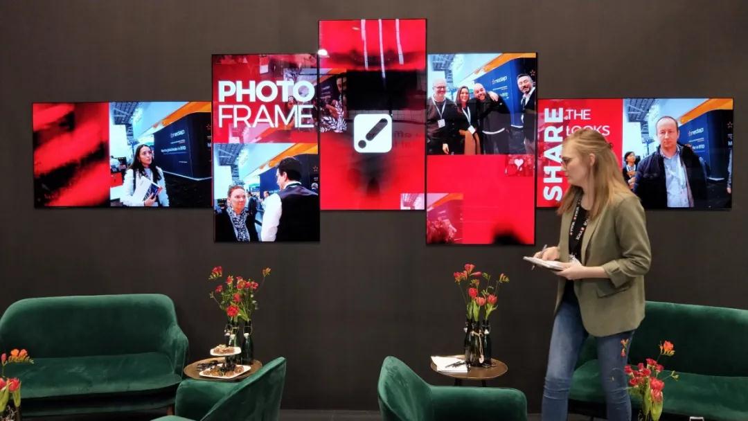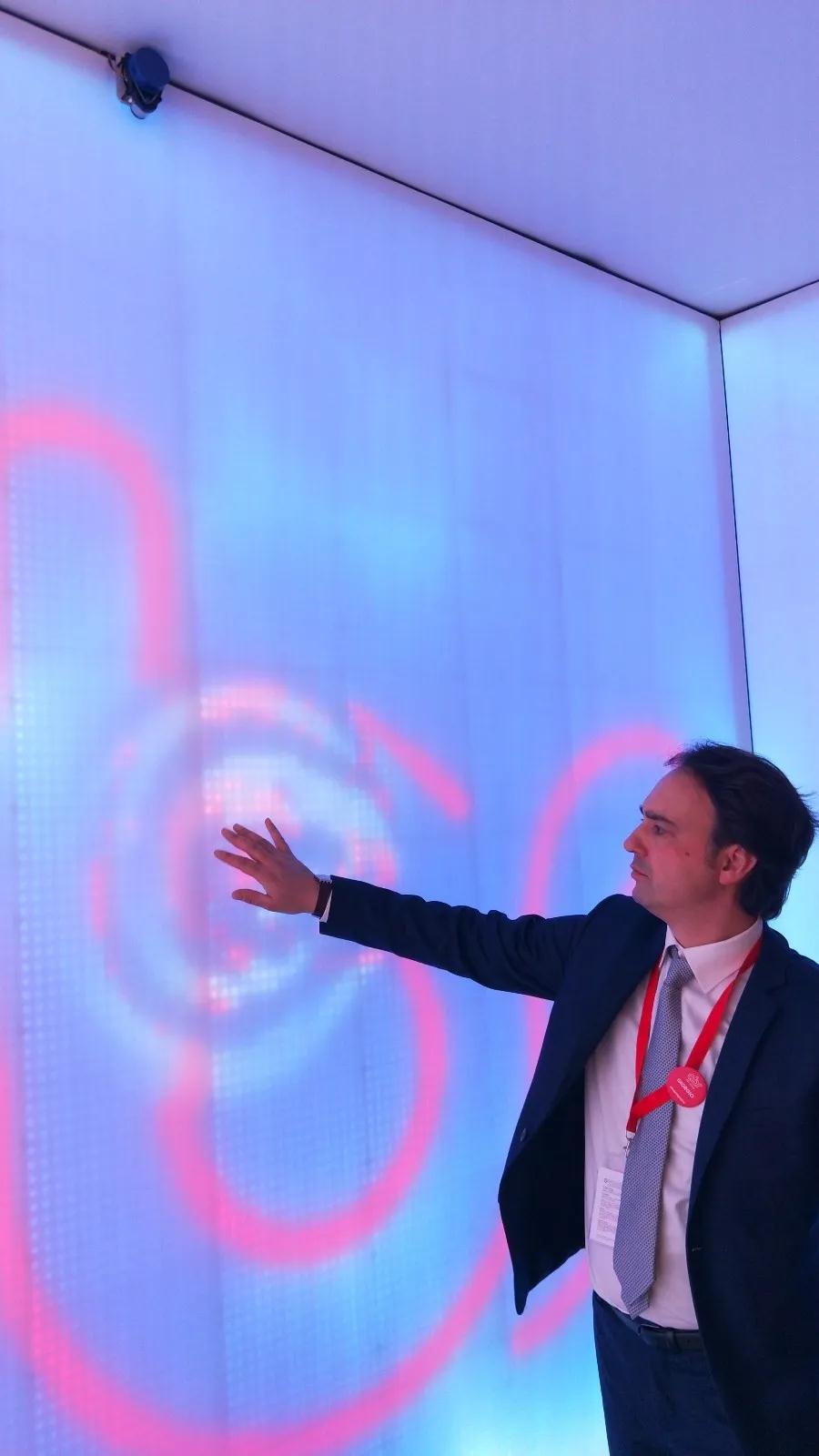 這組屏幕拼接方式很獨特,每塊屏幕大概只有10毫米的厚度。實時捕捉著現(xiàn)場參與體驗的人群。