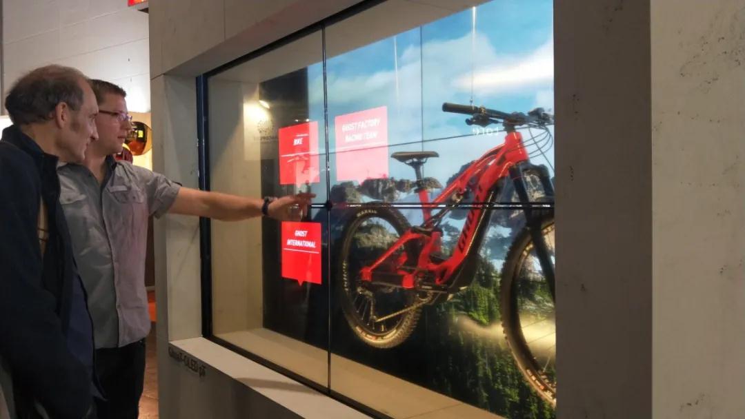 屏幕在零售店面設(shè)計中占據(jù)著舉足輕重的地位,是視覺傳播的主要陣地。LG品牌占據(jù)著主要的市場。鏡面屏、透明屏以及他們組成的拼接屏越來越得到廣泛的應(yīng)用。由四塊透明屏組成的櫥窗,兼具觸摸功能。當人在距離兩米以上時顯示廣告(不透明),兩米以內(nèi)則變?yōu)橥该黠@示里面的自行車,同時觸摸上面的顏色模塊展示產(chǎn)品的各項信息數(shù)據(jù)。
