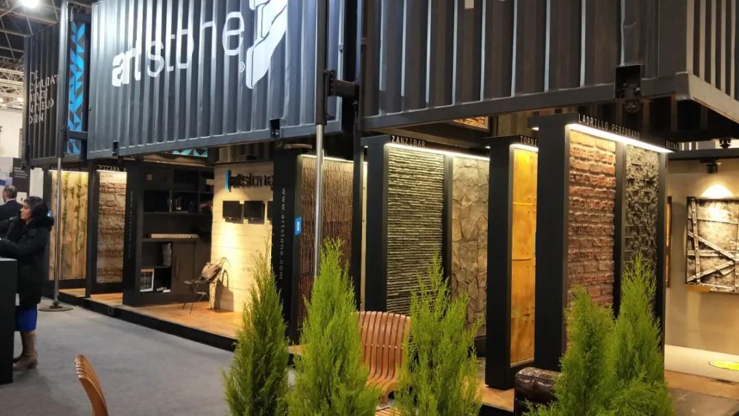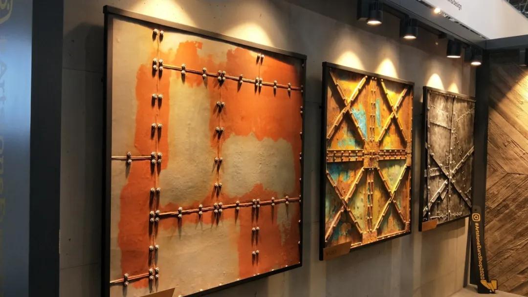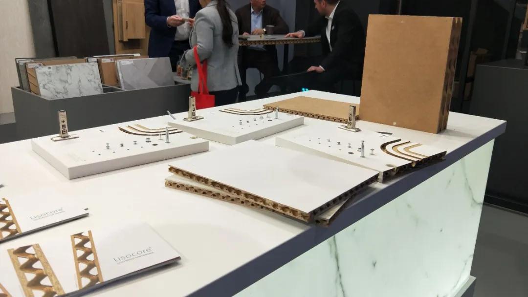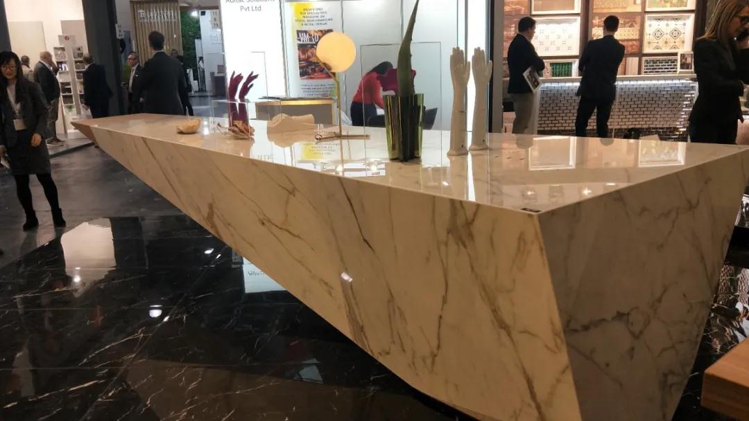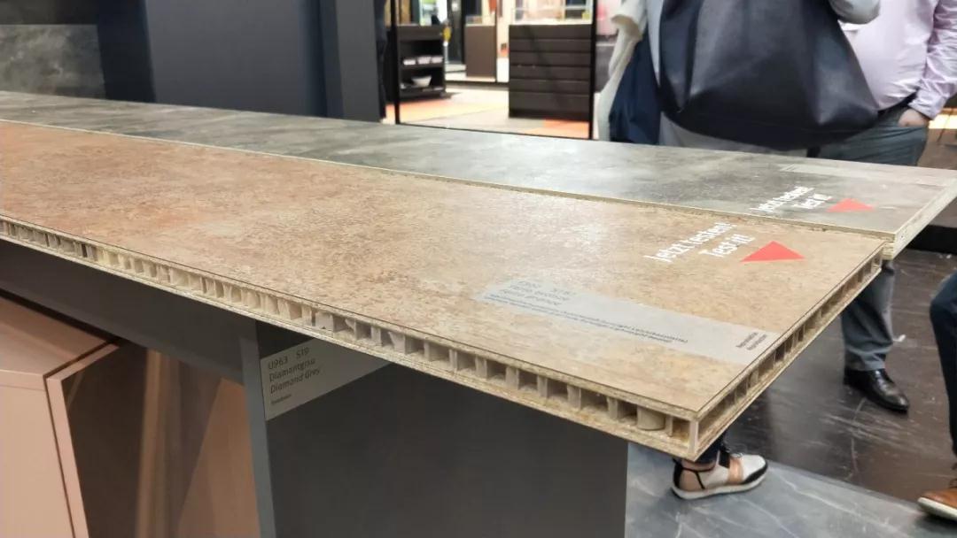 材 料 是科學技術(shù)發(fā)展的結(jié)果,同時材料的應(yīng)用也會帶來新技術(shù)的變革。本次展會的材料展區(qū)整體呈現(xiàn)著輕量化、復(fù)合化、高仿真的特點。這些特點主要體現(xiàn)在各類型高仿真的陶瓷薄板(仿石紋理、仿木紋理)、仿鏡面薄膜、殼體結(jié)構(gòu)復(fù)合板、仿真石材等。
