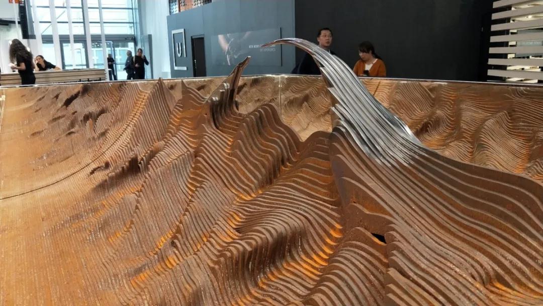 迎面而來的是接待區(qū),在此設(shè)計(jì)公司給大家呈現(xiàn)了一組鋼制的雕塑。這個(gè)雕塑像山脈、似浮云,鋼鐵的堅(jiān)硬與柔軟的外觀形成鮮明的對比。整個(gè)雕塑沉浸在一個(gè)箱體中,露出來的部分代表是設(shè)計(jì)的結(jié)果,是最靚麗動(dòng)人的部分。而雕塑大部分則是沉浸在箱體中,復(fù)雜而多變,代表著設(shè)計(jì)背后復(fù)雜而大量的工作。頓時(shí)“感同身受”。