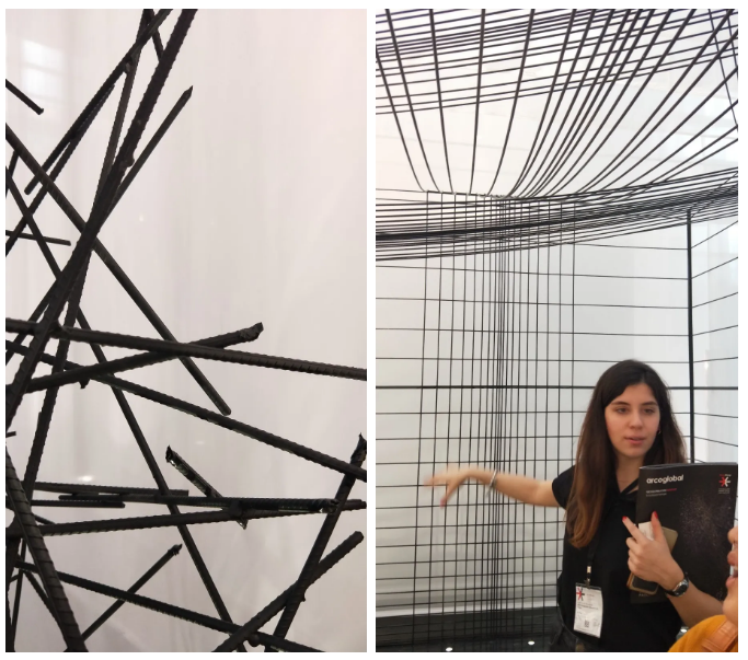 背景墻右邊是展區(qū)的入口,在此設(shè)計(jì)師用復(fù)雜而沒有規(guī)則的“鳥巢式”鋼筋做成了穹頂空間,代表著每一次設(shè)計(jì)都是從紛繁復(fù)雜的、千頭萬緒的情境中開始的,隨后鋼筋變成了有節(jié)奏和韻律的五線譜,即是設(shè)計(jì)終于理清的思路,向著光明進(jìn)發(fā)。