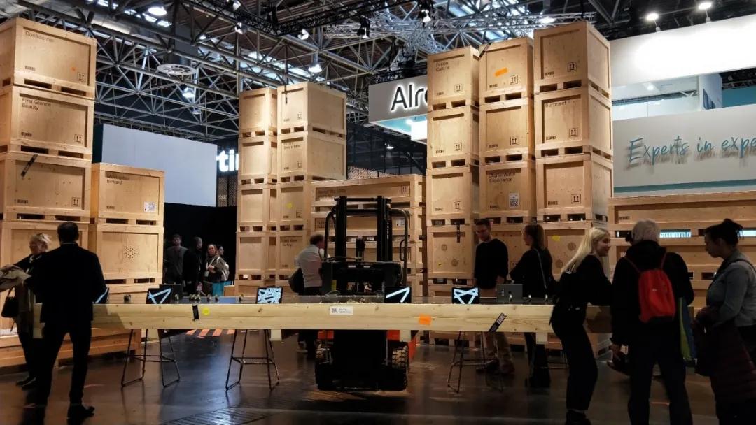 DART的展區(qū)則是用了大量的包裝箱,滿滿工業(yè)風(fēng)。據(jù)說每個(gè)箱子上有一個(gè)小孔,從小孔中望去是該公司做的一個(gè)個(gè)鮮活的案例,這也許就是對設(shè)計(jì)另外一種別致的展現(xiàn)方式。中央有一個(gè)長約6米的木質(zhì)展臺(tái),干脆沒有桌腿,是被一臺(tái)叉車托舉著,挺佩服設(shè)計(jì)師和決策者的想法。