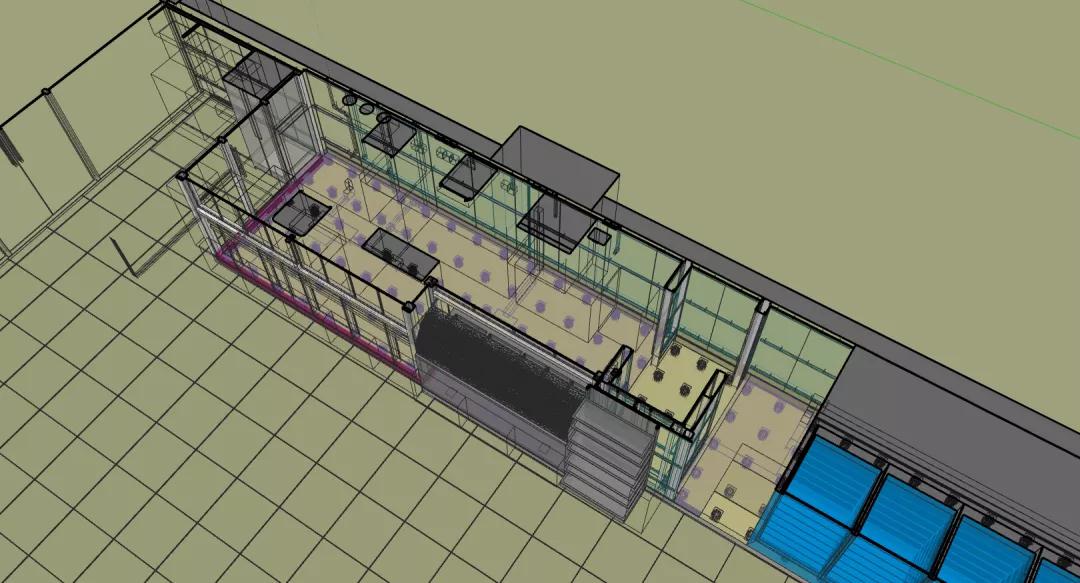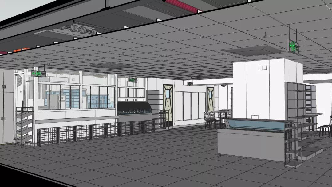 店鋪分為客區(qū)和廚區(qū)兩大區(qū)域,涉及到裝修、強(qiáng)弱電、給排水、通風(fēng)、空調(diào)、消防等多種專業(yè),涉及到甲方的家具和設(shè)備廠家10余家。設(shè)備數(shù)量共計(jì)30余種,僅強(qiáng)電面板插座就有150余個(gè)。專業(yè)交叉多,管線復(fù)雜,現(xiàn)場(chǎng)條件苛刻,疫情期間的各種管控帶來(lái)的人員管理和材料采購(gòu)困難都是此次項(xiàng)目實(shí)施的難點(diǎn)。而“BIM+裝配式”就在此刻助力店鋪快速落地,精準(zhǔn)實(shí)施。