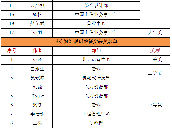 作為兩場(chǎng)征文比賽的評(píng)委之一,常宏品牌推廣部總監(jiān)張英宣向大家介紹了這兩場(chǎng)征文比賽的評(píng)選規(guī)則以及大致情況。常宏“宏鳥(niǎo)”征文大賽自征集以來(lái),共征集了174份參賽作品,經(jīng)過(guò)初評(píng)、復(fù)評(píng)、公示,共評(píng)選出了一名一等獎(jiǎng)、兩名二等獎(jiǎng)、三名三等獎(jiǎng)、十名鼓勵(lì)獎(jiǎng)以及一名人氣獎(jiǎng)?!秺Z冠》觀(guān)后感征文從87份作品中,共評(píng)選出了一名一等獎(jiǎng)、兩名二等獎(jiǎng)以及五名三等獎(jiǎng)。